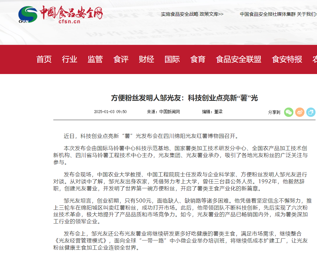 轉(zhuǎn)載中國(guó)食品安全網(wǎng)——方便粉絲發(fā)明人鄒光友:科技創(chuàng)業(yè)點(diǎn)亮新“薯”光